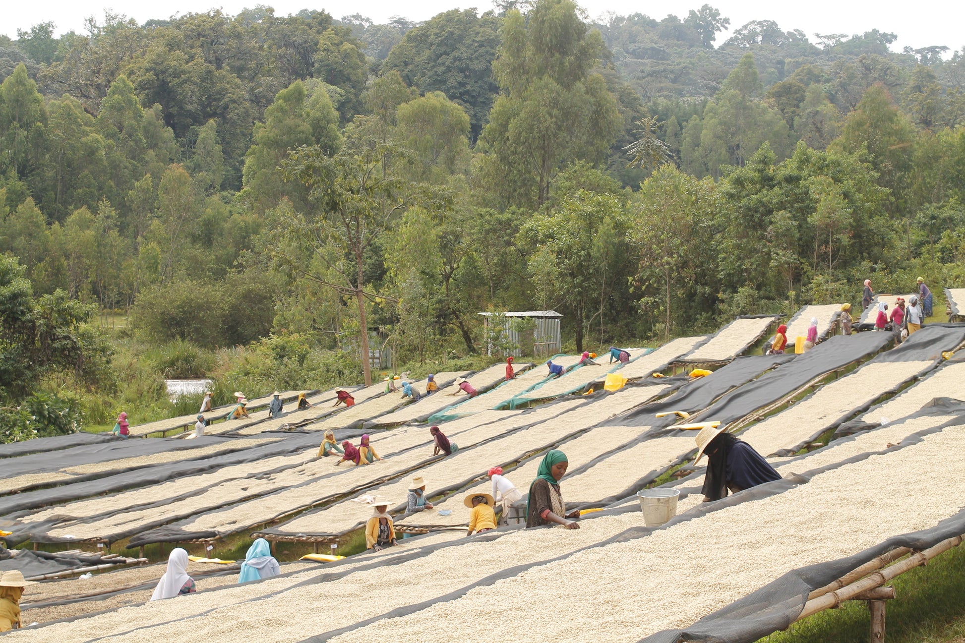 Toutes les cerises acceptées sont ensuite déposées en fines couches sur des lits surélevés pendant environ 18 jours. La station dispose de 280 lits de séchage. Chaque lit est identifié par un code qui simplifie le suivi de la traçabilité et de l'état de transformation.