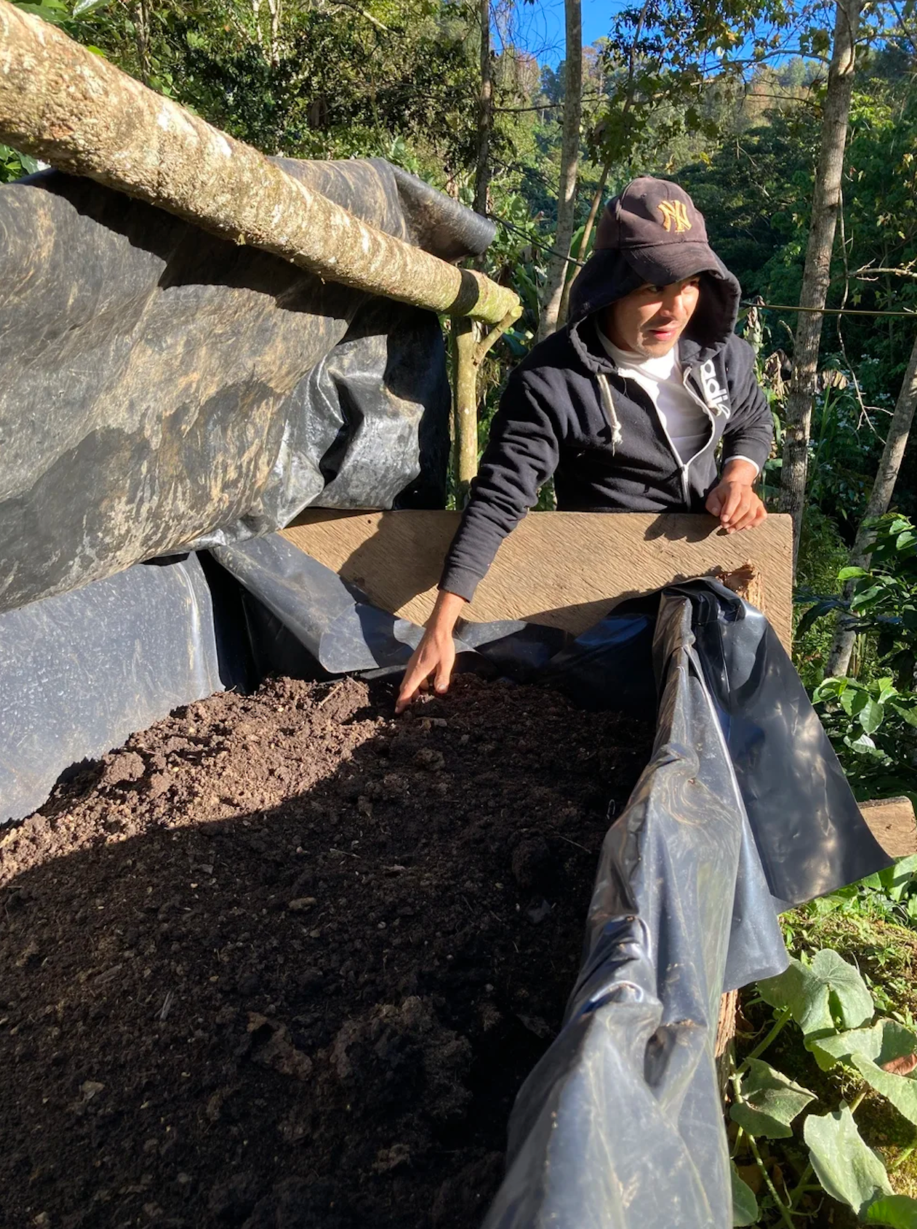 Freddy Blandino est issu de la deuxième génération de producteurs. Son père, Don Roman, a légué une partie de sa ferme “El Recuerdo” à son fils unique. Père et fils travaillent toujours ensemble dans les deux fermes. El Hormiguero produit du café sous ombrage, ne désherbe pas, et Freddy laisse volontairement des troncs d’arbre morts de part et d’autre de la ferme pour abriter la biodiversité de sa ferme.